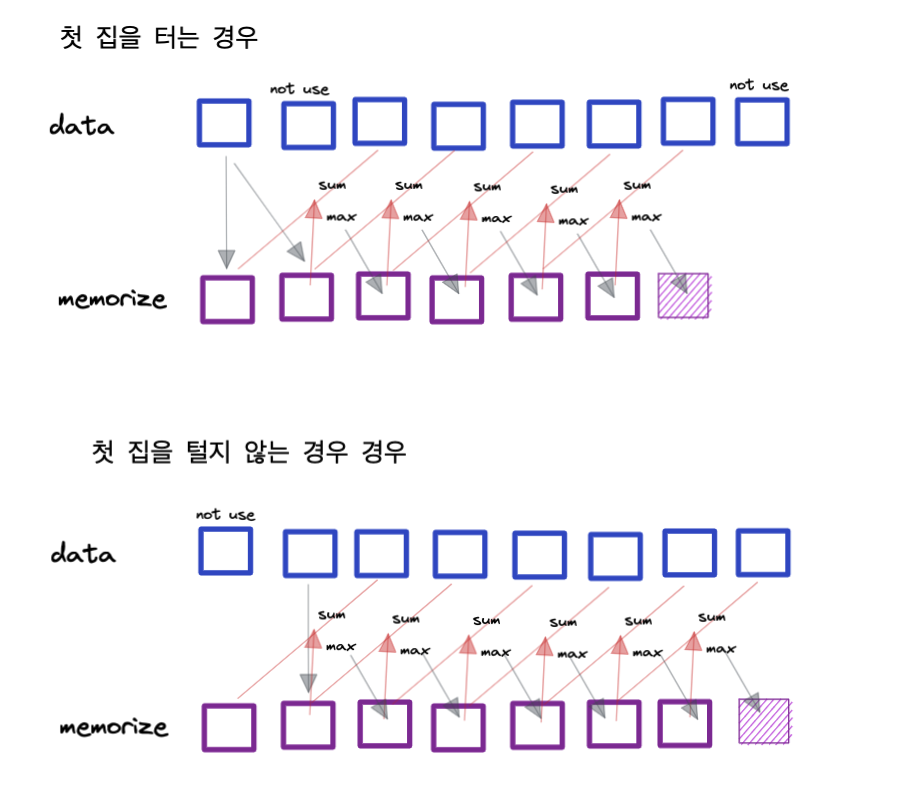 그리고 원형 구조기 때문에 발생 가능한 경우는 아래와 같이 첫 집을 터는 경우 마지막 집을 털지 않고, 첫 집을 털지 않는 경우는 마지막 집까지 탐색한다.
