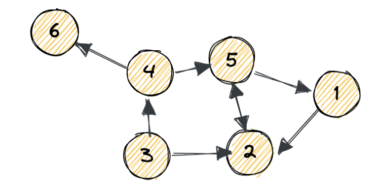 $d_{in}(1) = 1, d_{out}(1) = 1$ $d_{in}(2) = 3, d_{out}(2) = 1$ $d_{in}(3) = 0, d_{out} = 2$ $d_{in}(4) = 1, d_{out}(4) = 2$ $d_{in}(5) = 2, d_{out}(5) = 2$ $d_{in}(6) = 1, d_{out}(6) = 0$ |