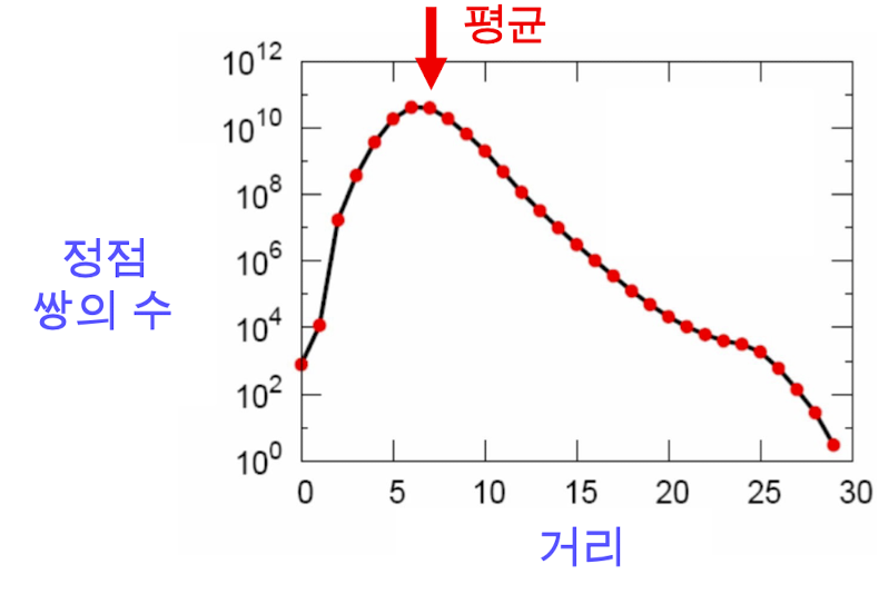 - 정점 간의 평균 거리는 7 (거대 연결 구조만 고려한 경우)