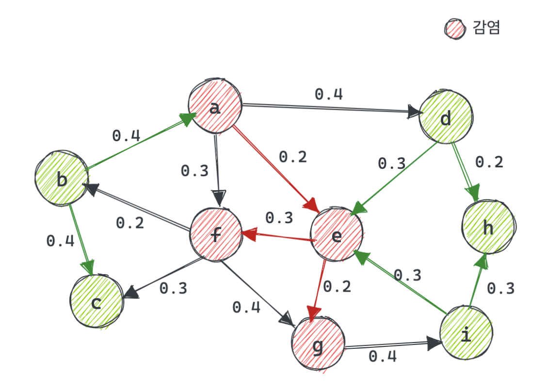 - 각 간선 (u, v)의 가중치 $p_{uv}$ : u가 감염, v가 비감염 시 u가 v를 감염시킬 확률