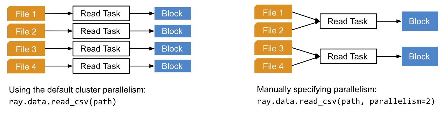 → 각 read task는 각 파일에 할당되어 output 블록을 생성함 - 수동으로 병렬처리를 할 수도 있는데 읽기에 대한 최종 처리는 항상 기본 데이터 시트의 파일 수로 제한됨