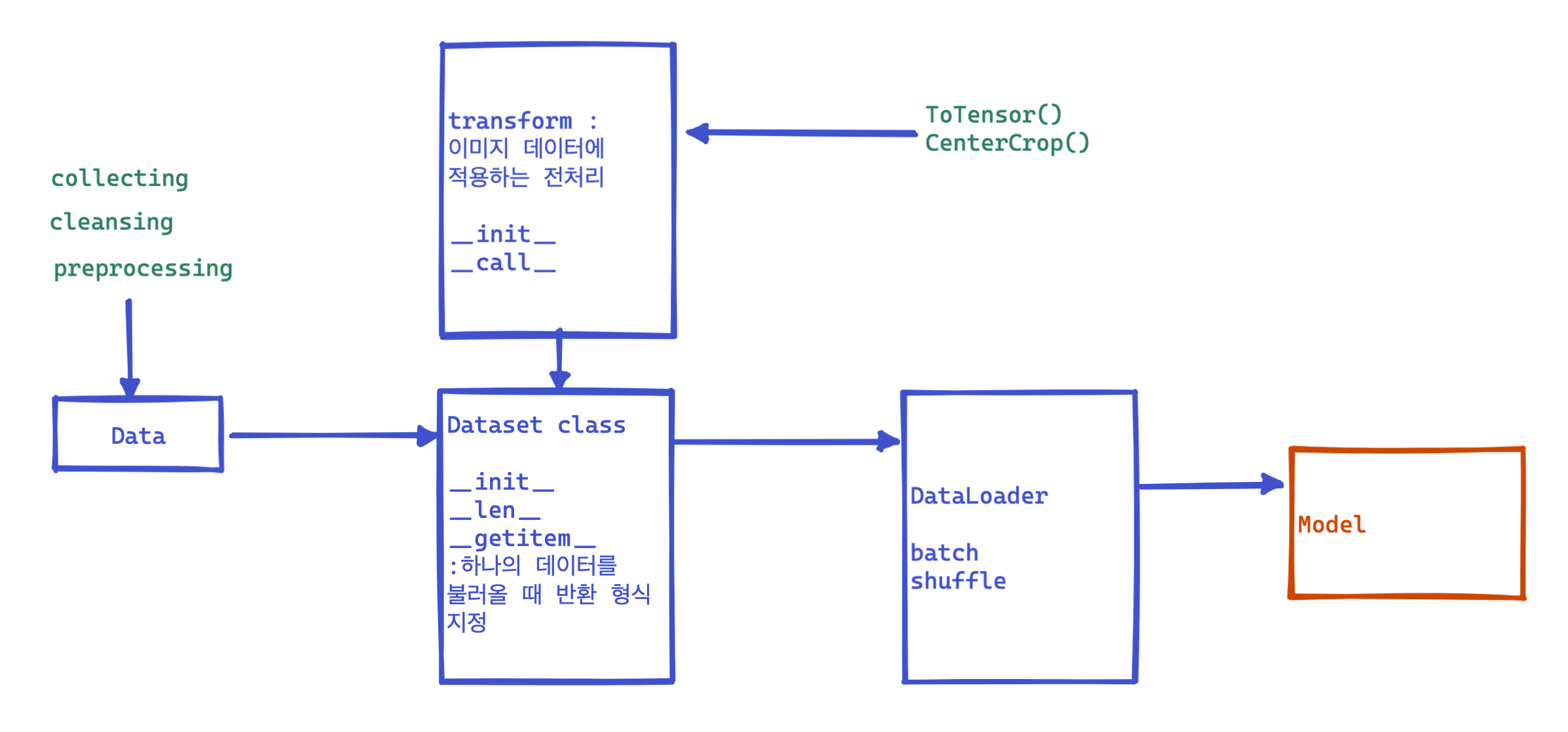 - 모든 것을 데이터의 생성 시점에 처리할 필요는 없음. 예를 들어 이미지의 Tensor변화는 학습 중 필요한 시점에 수행하면 됨