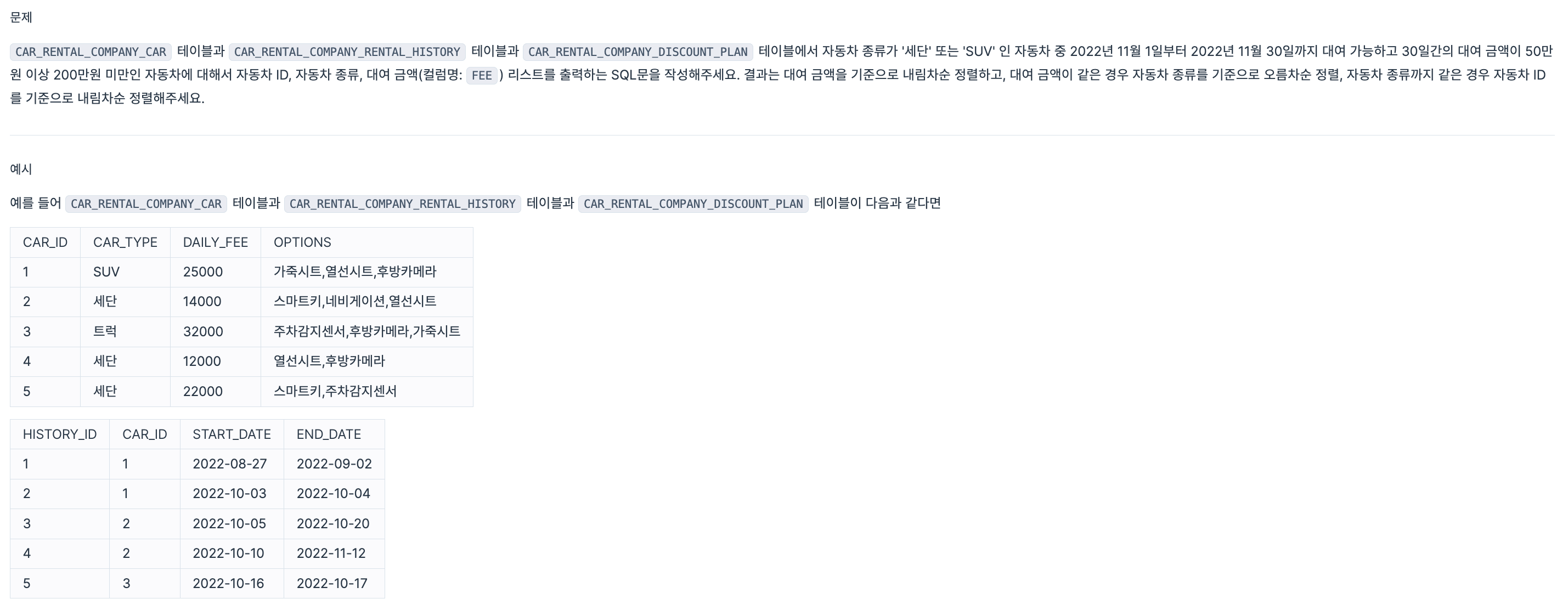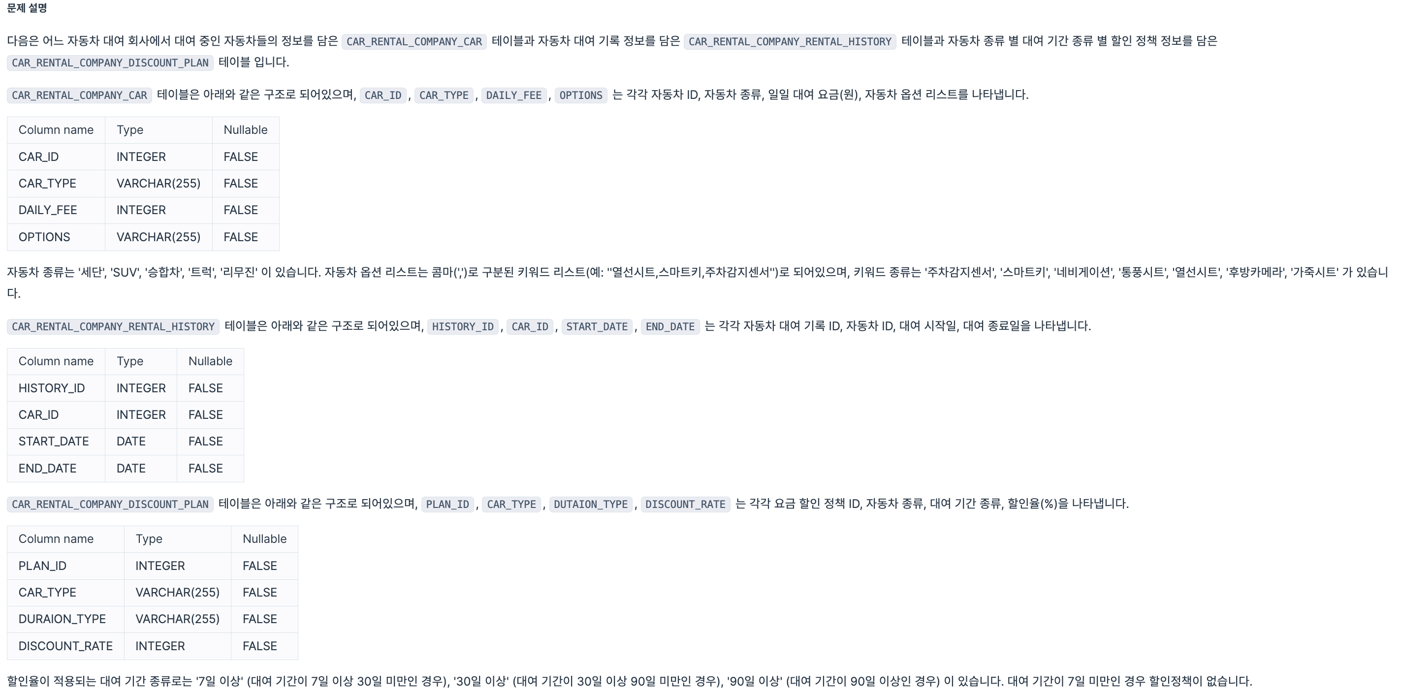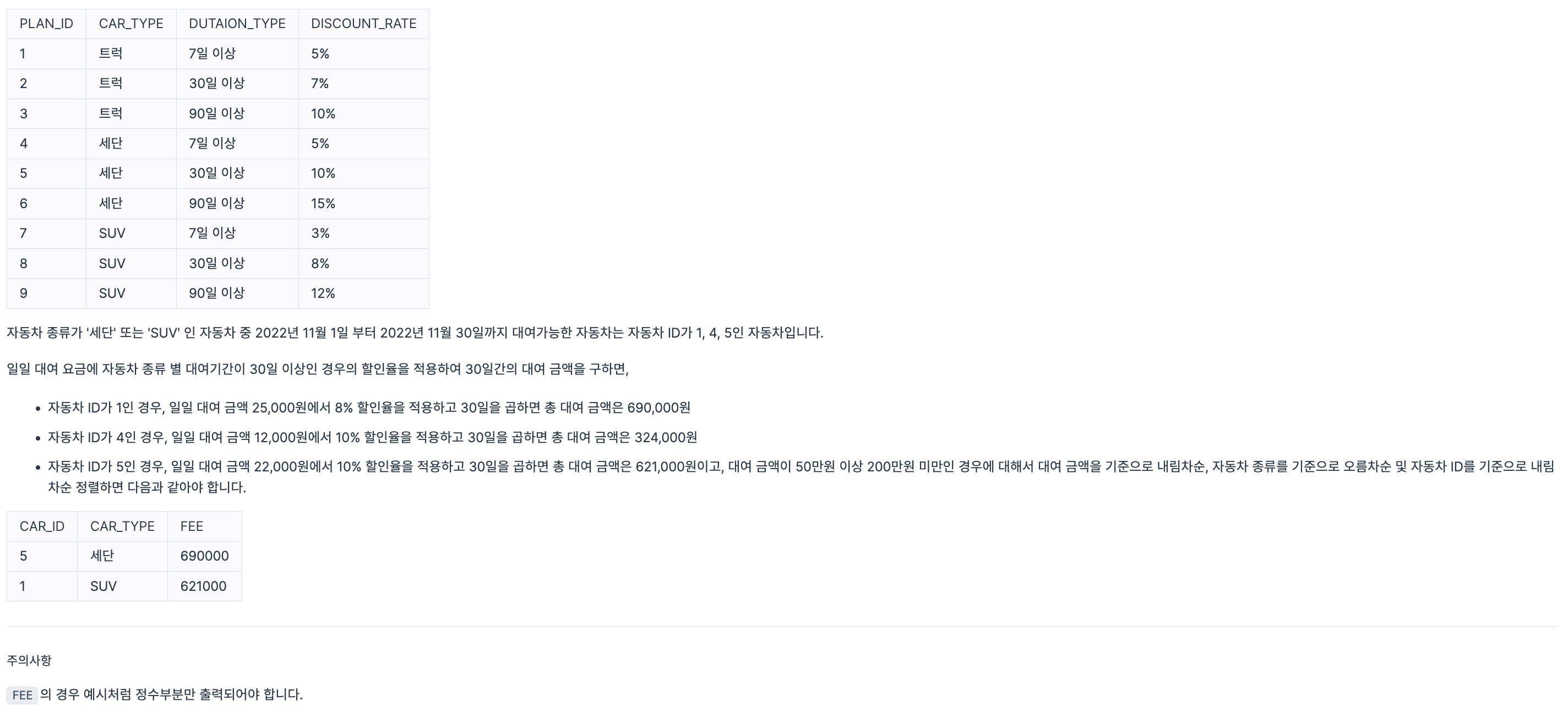 - CAR_RENTAL_COMPANY_CAR의 CAR_TYPE - CAR_RENTAL_COMPANY_DISCOUNT_PLAN의 CAR_TYPE