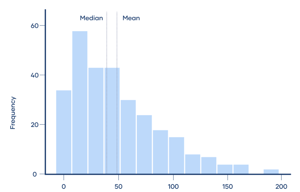 즉, right-skewed 분포는 거의 항상 평균이 중앙값보다 크다. 평균보다 훨씬 큰 값을 가지는 관측치들이 중앙값보다 평균에 영향을 미치기 때문이다.