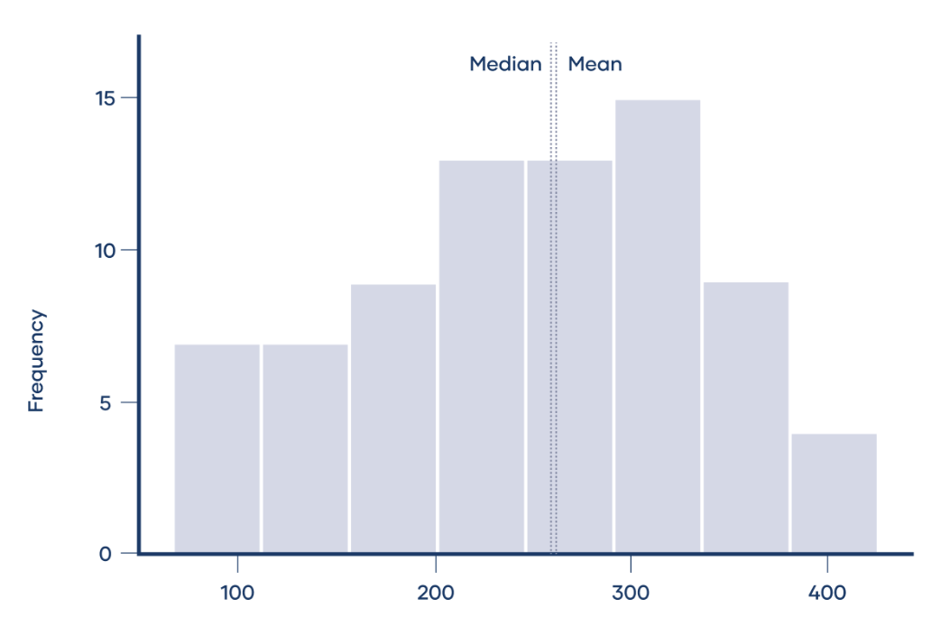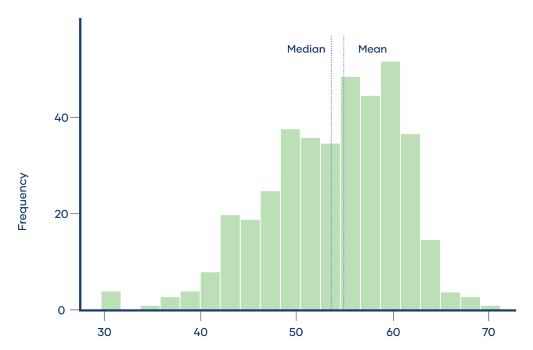 아래 차트를 보면 피크와 비교해서 왼쪽의 분포가 더 긴 것을 확인할 수 있다. left-skew 분포의 평균은 거의 항상 중앙값보다 작다.