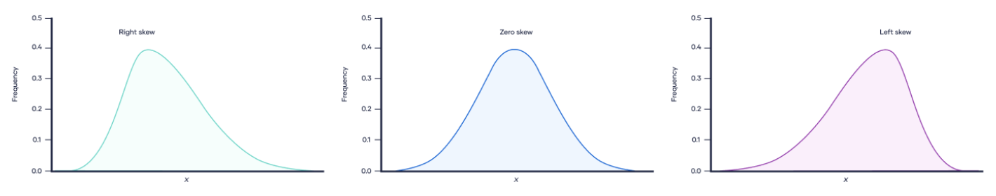 분포는 오른쪽 꼬리가 길거나(skewness > 0), 왼쪽 꼬리가 길거나(skewness < 0) 또는 0의 수치를 가질 수 있다.